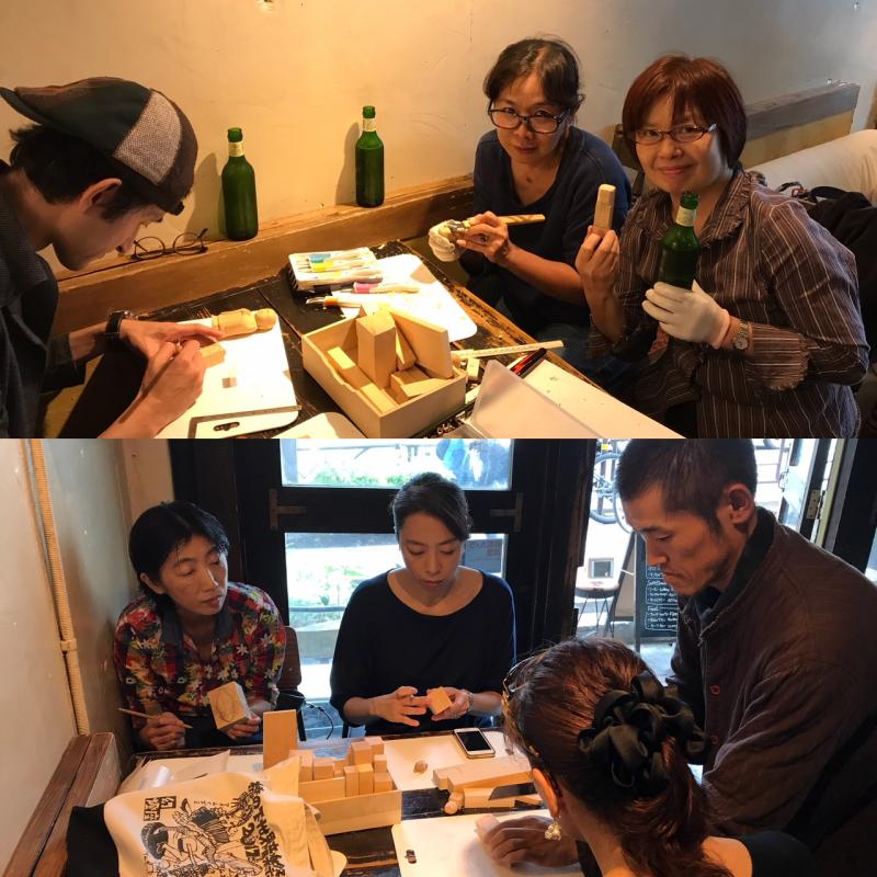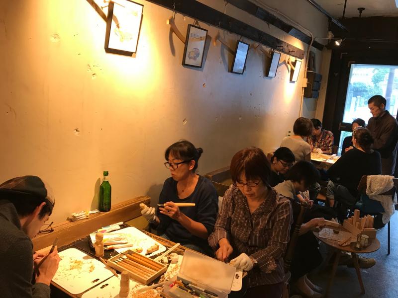 名古屋から仏像彫刻師の真野明日人さんを呼んで、彫刻のレクチャーを受けながら、みんなで思い思いのモチーフを彫刻しました。