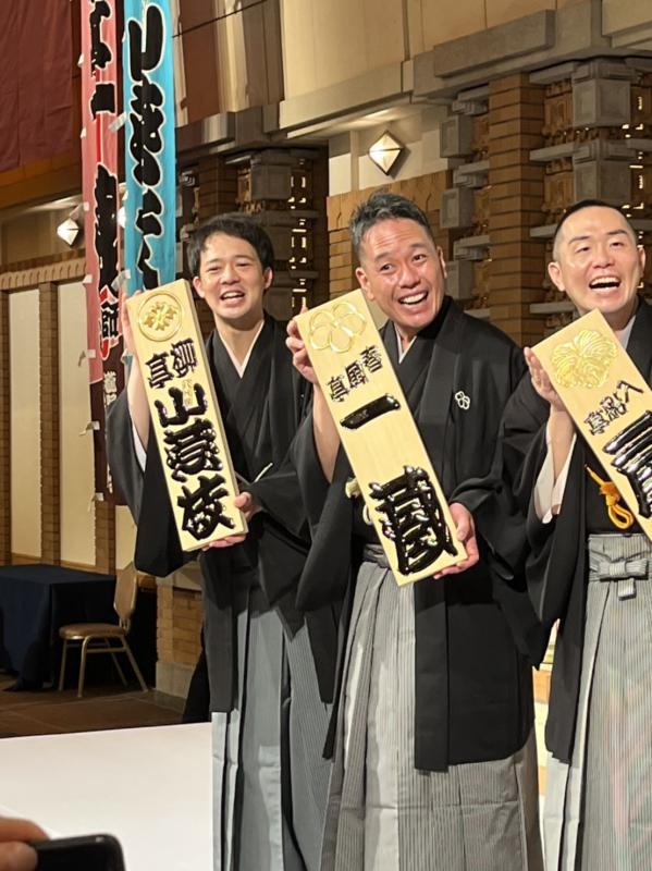 市弥改め柳亭小燕枝、小辰改め入船亭扇橋、春風亭一蔵の合同真打昇進パーティーが開催されました。