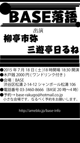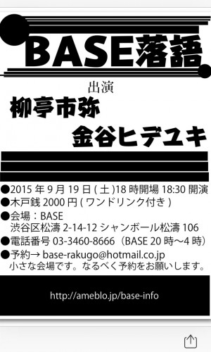 9月のBASE落語は立川志の太郎さんをゲストにお迎えします。